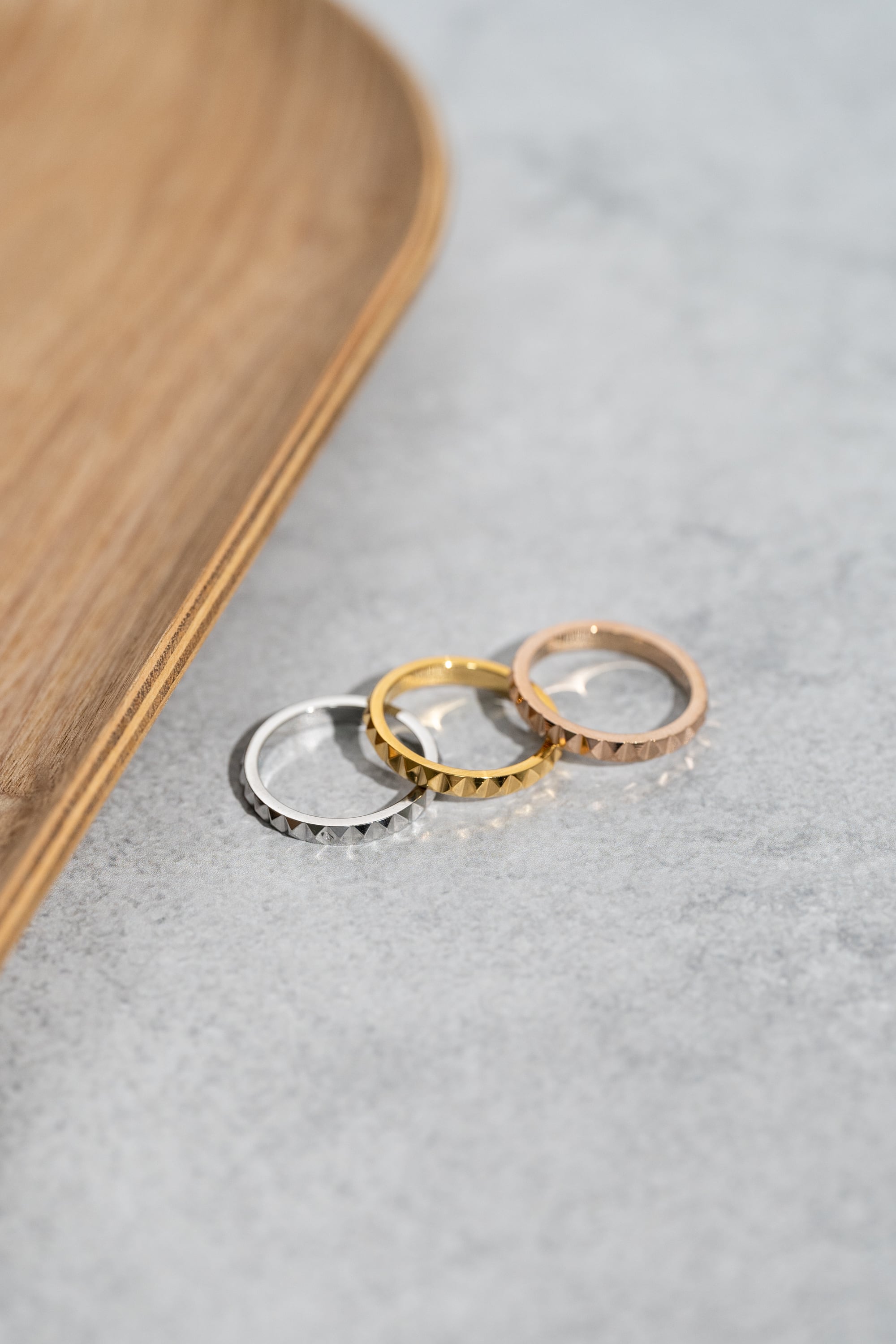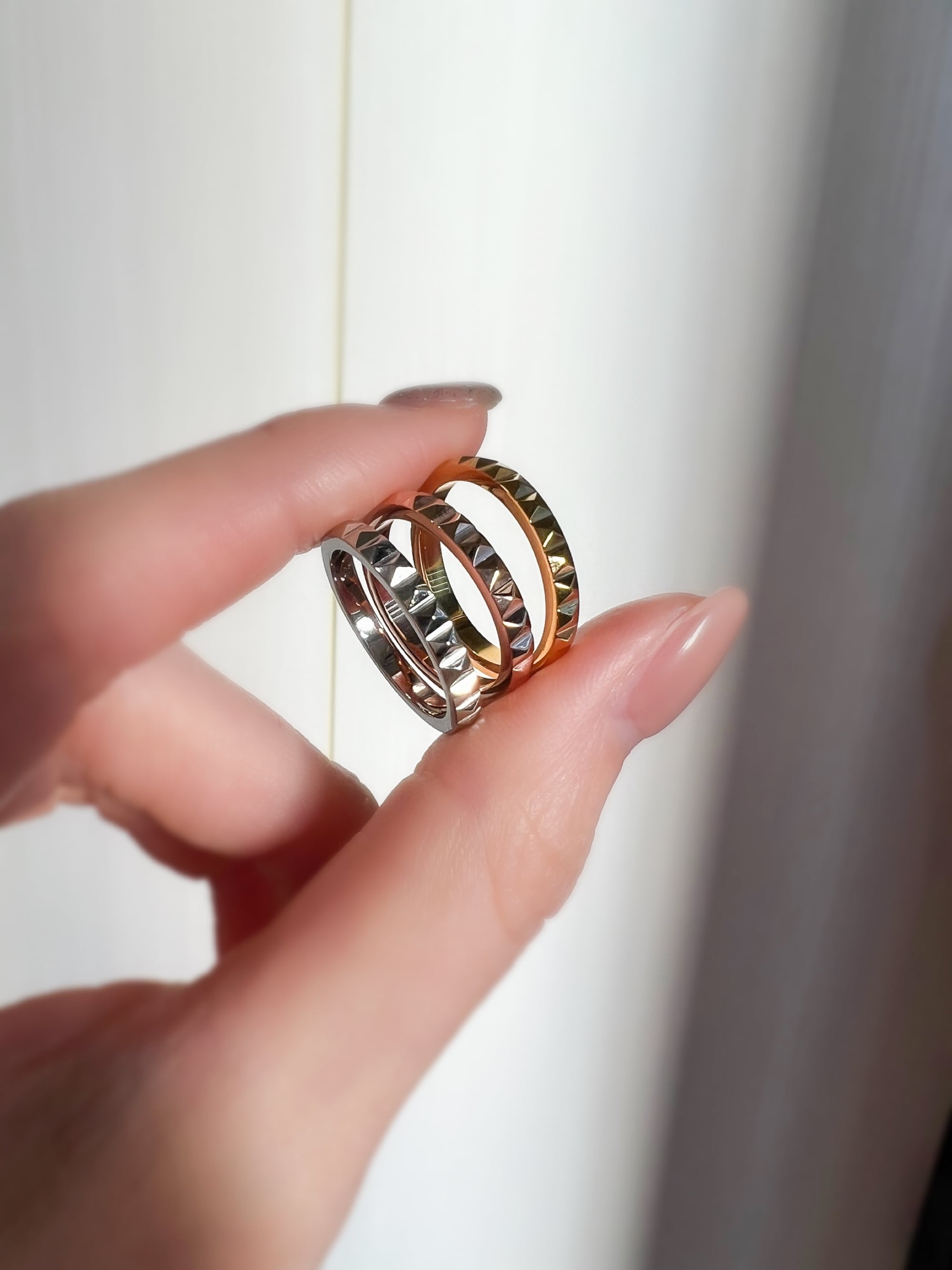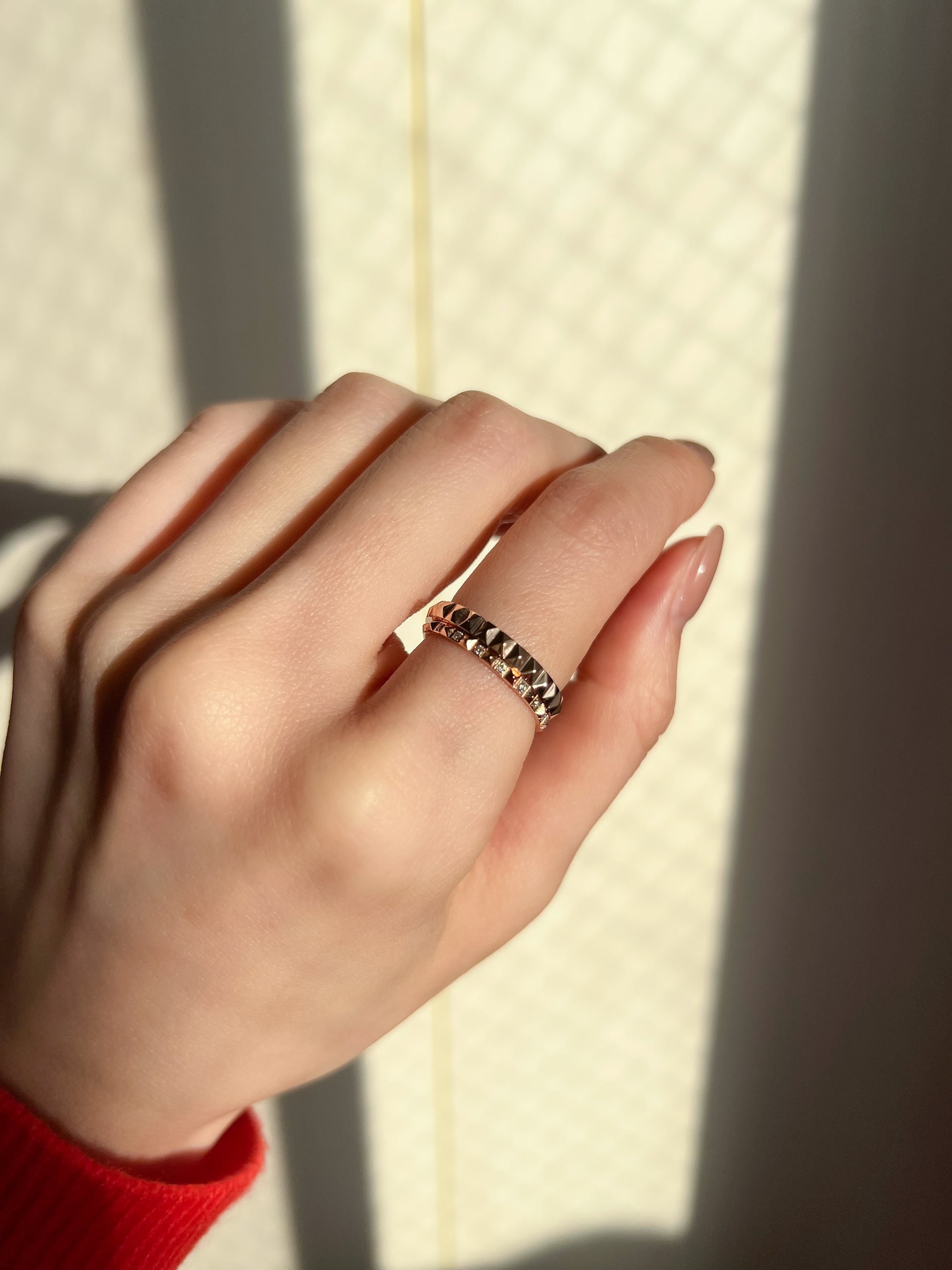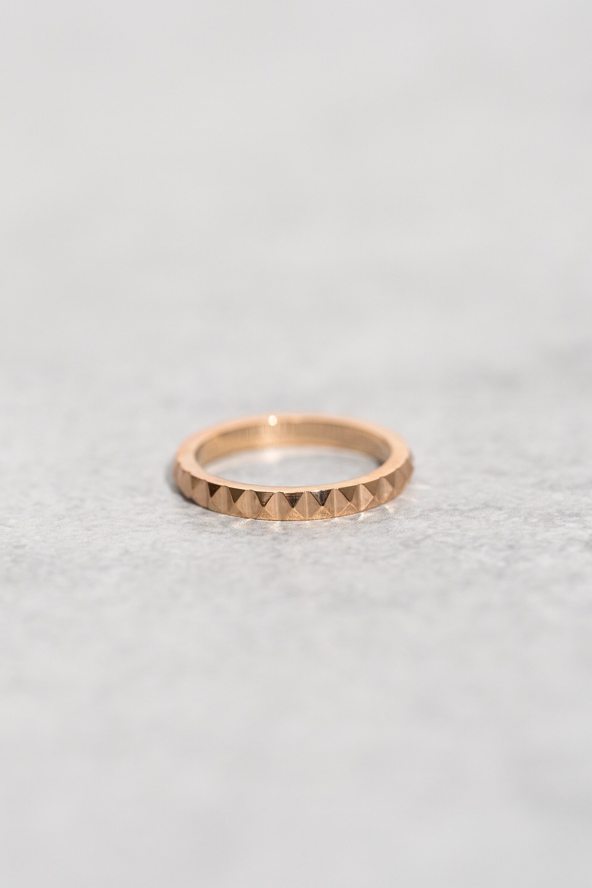 全周にわたる丸みの帯びたエタニティタイプのスタッズは多面的なデザインで光をあらゆる角度から反射するので、キラキラと輝き存在感があります♡エッジの効いたデザインですが細身フレームのため洗練された指先を演出✨