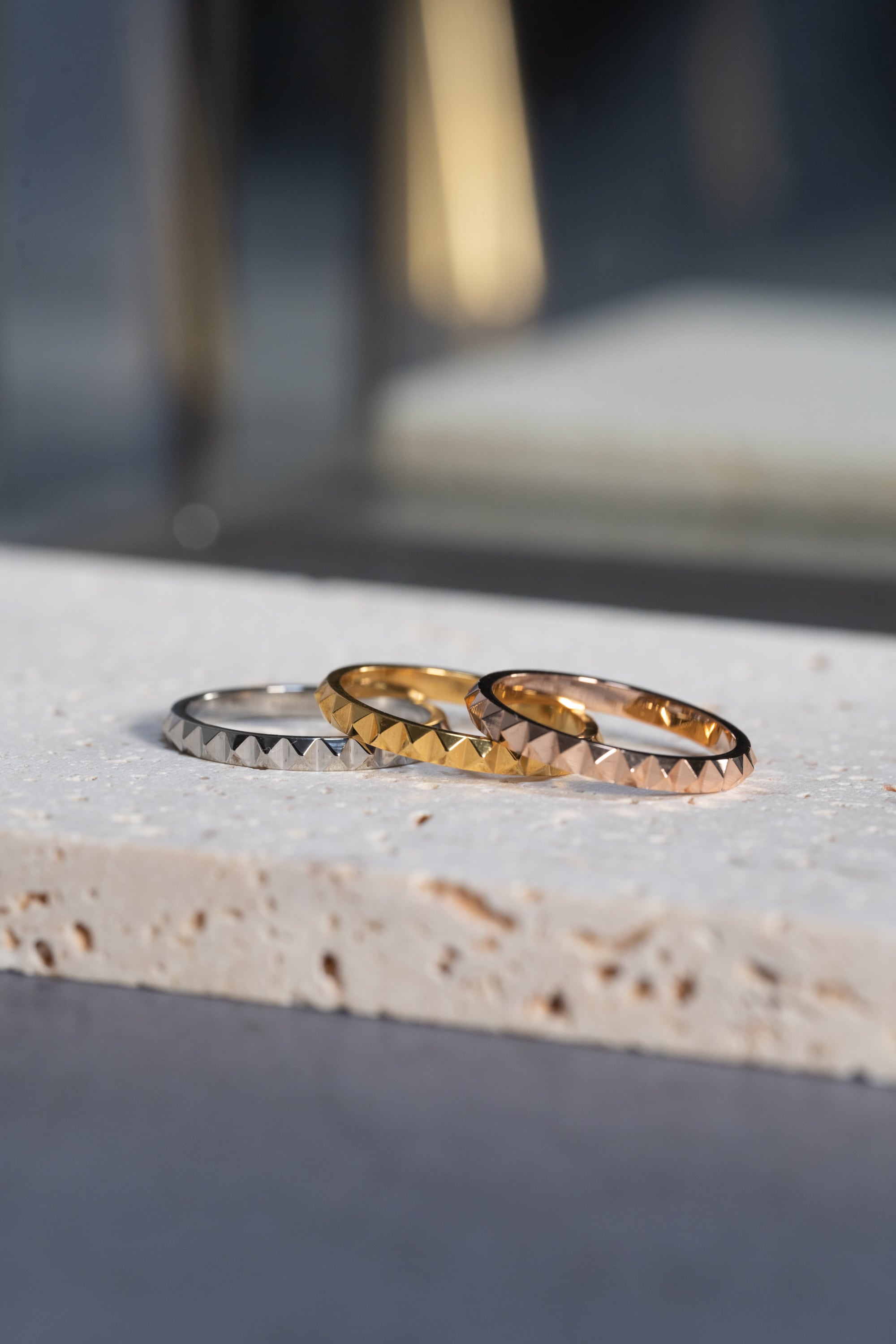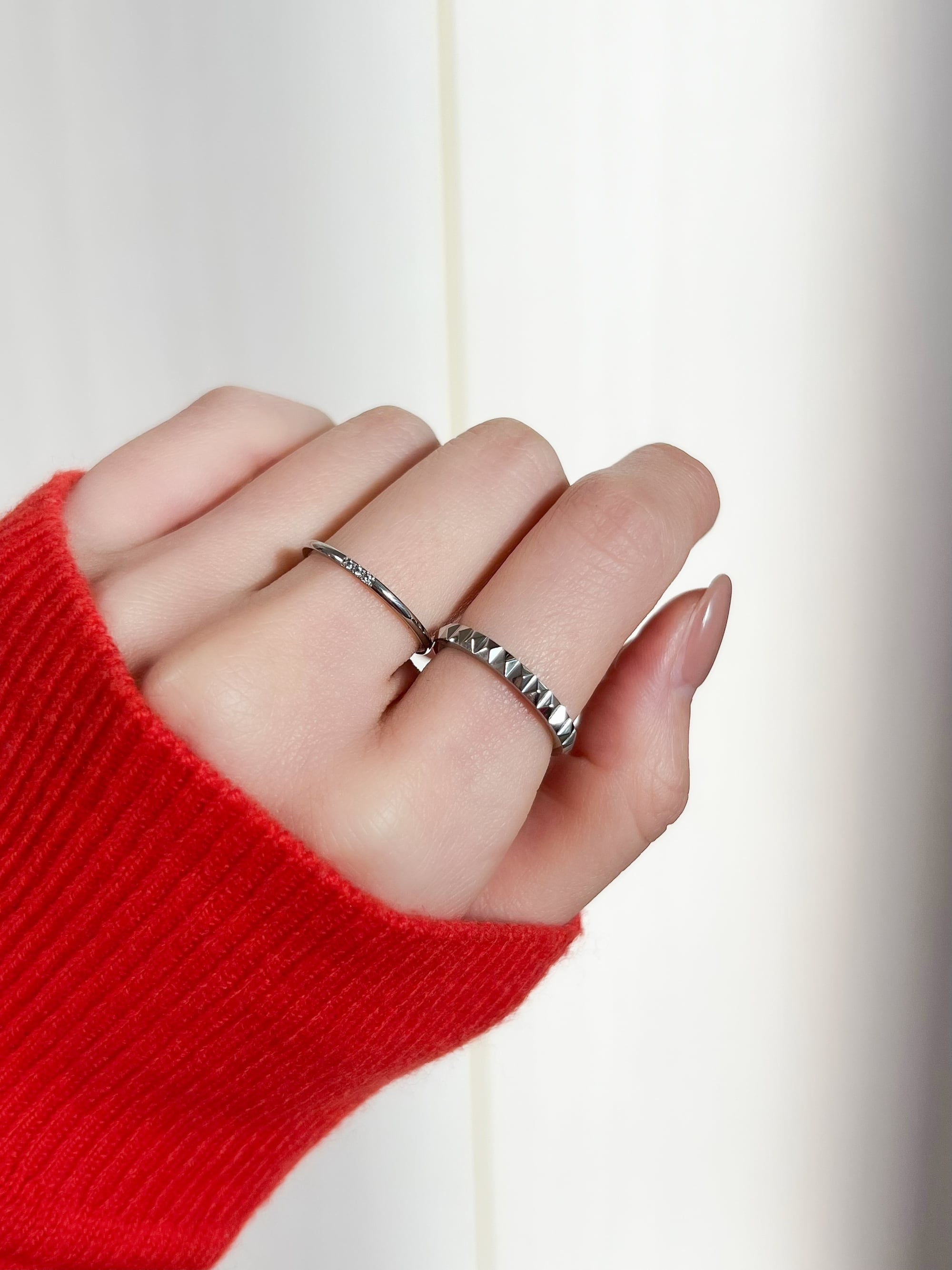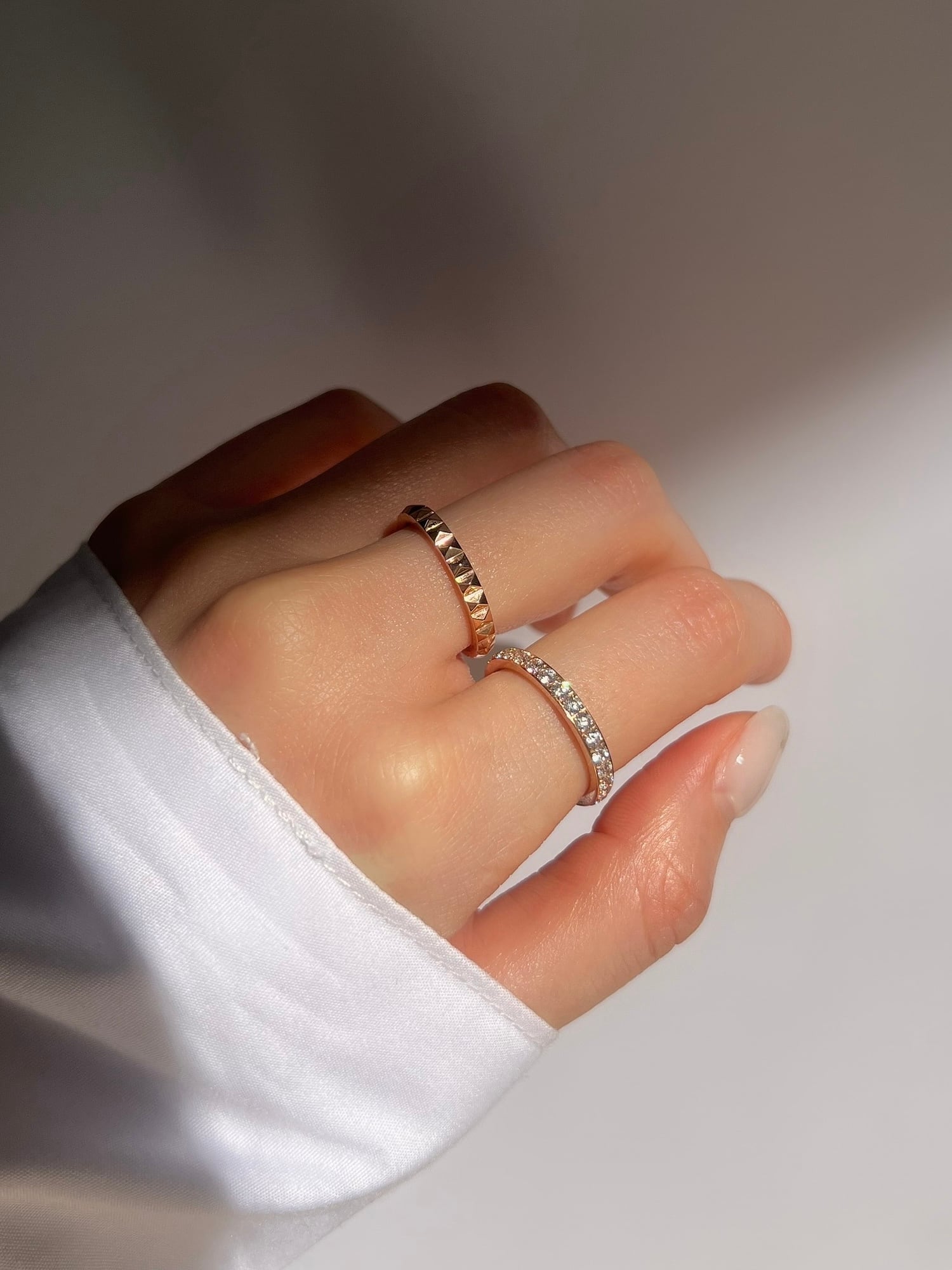 全周にわたる丸みの帯びたエタニティタイプのスタッズは多面的なデザインで光をあらゆる角度から反射するので、キラキラと輝き存在感があります♡エッジの効いたデザインですが細身フレームのため洗練された指先を演出✨