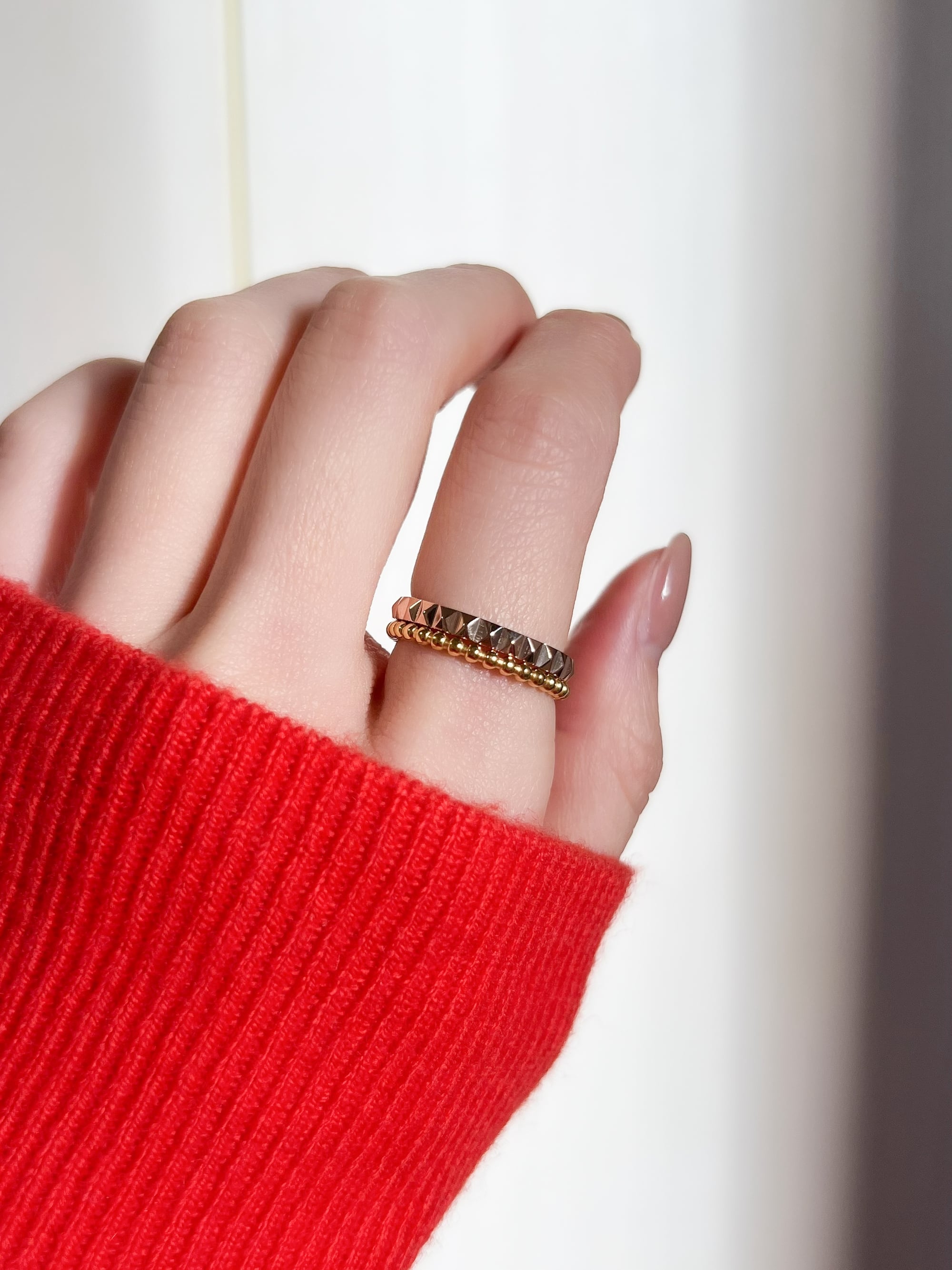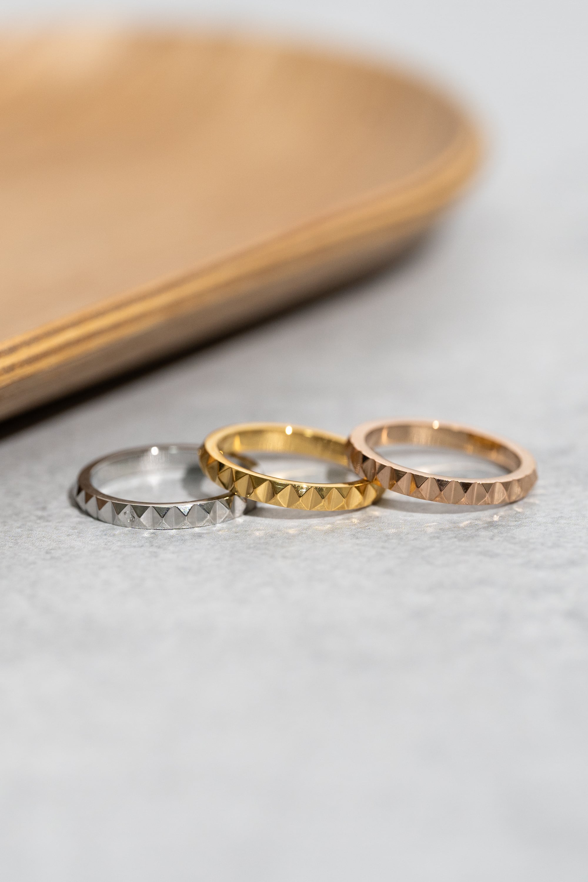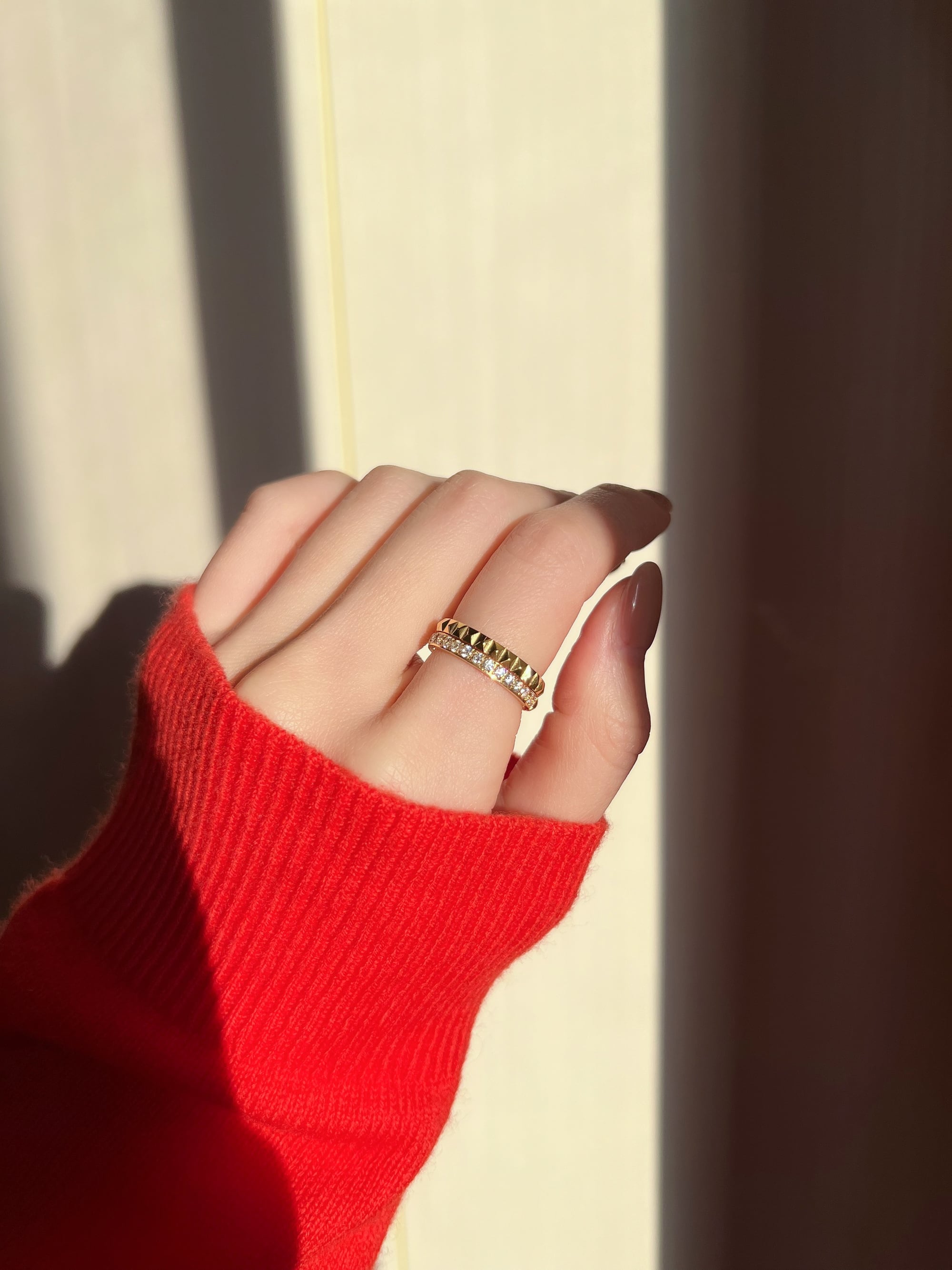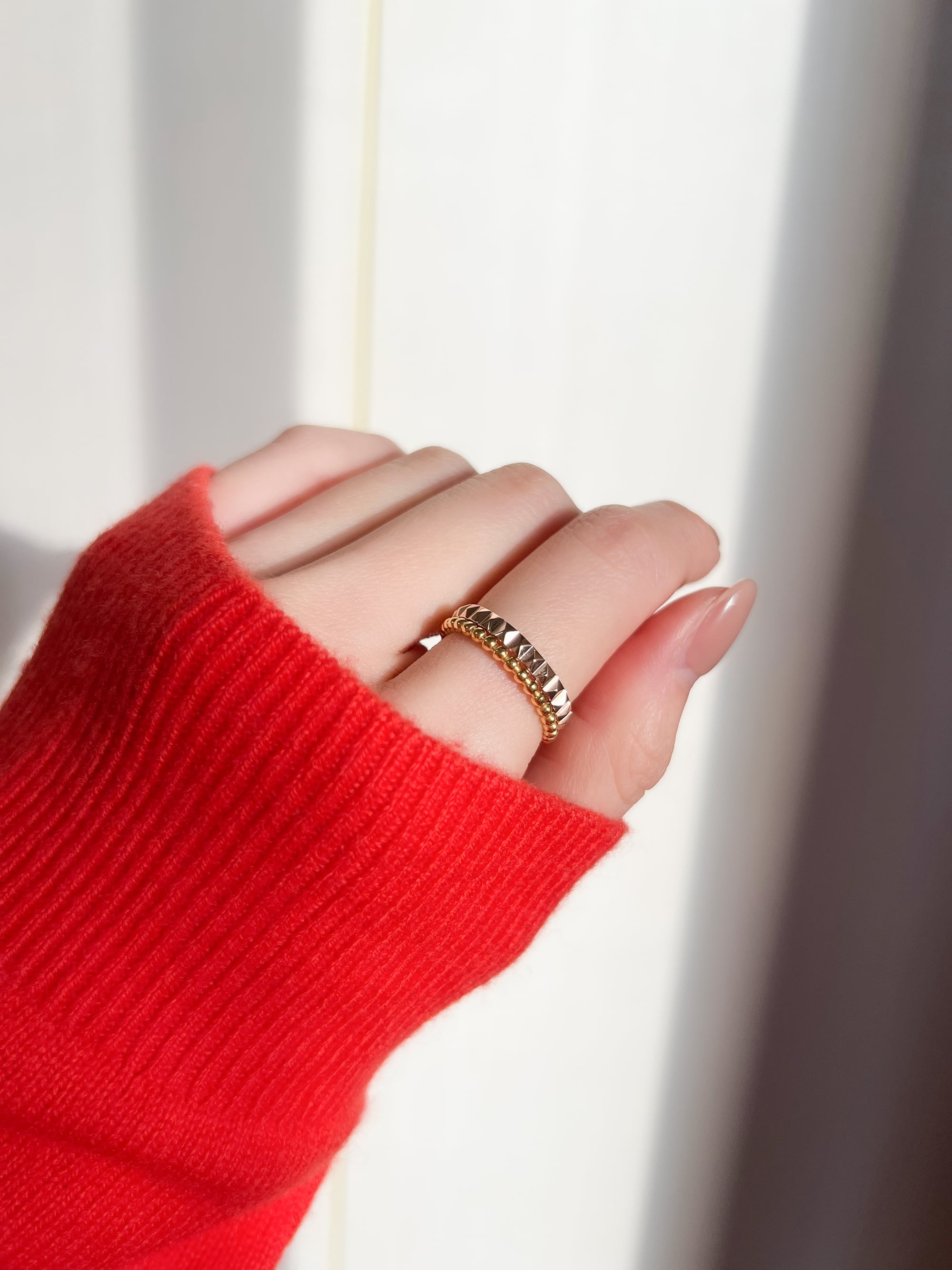 全周にわたる丸みの帯びたエタニティタイプのスタッズは多面的なデザインで光をあらゆる角度から反射するので、キラキラと輝き存在感があります♡エッジの効いたデザインですが細身フレームのため洗練された指先を演出✨