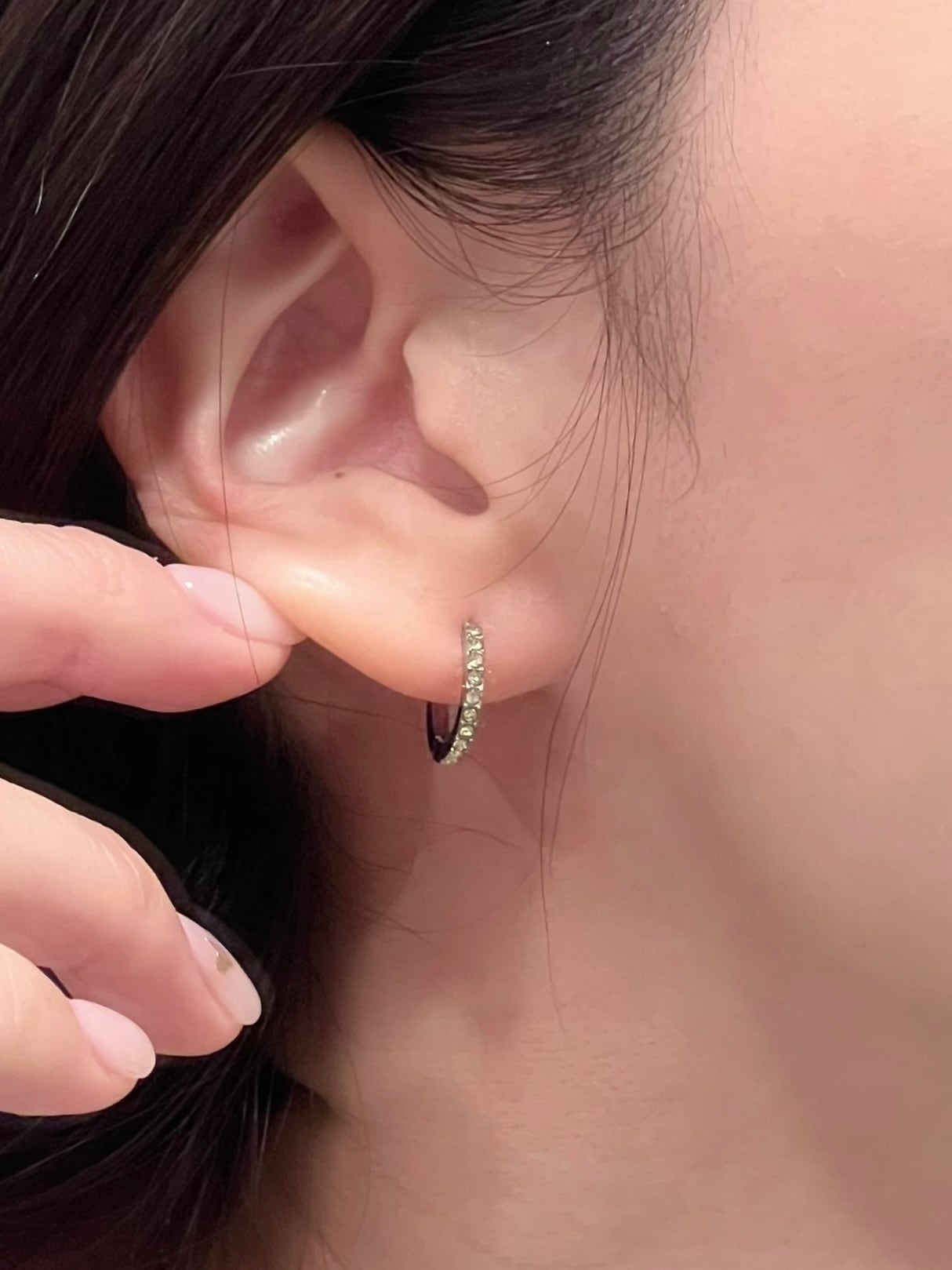 キャッチレスのワンタッチピアスの半分にキラキラと上品に輝く極小ジルコニアを設置した