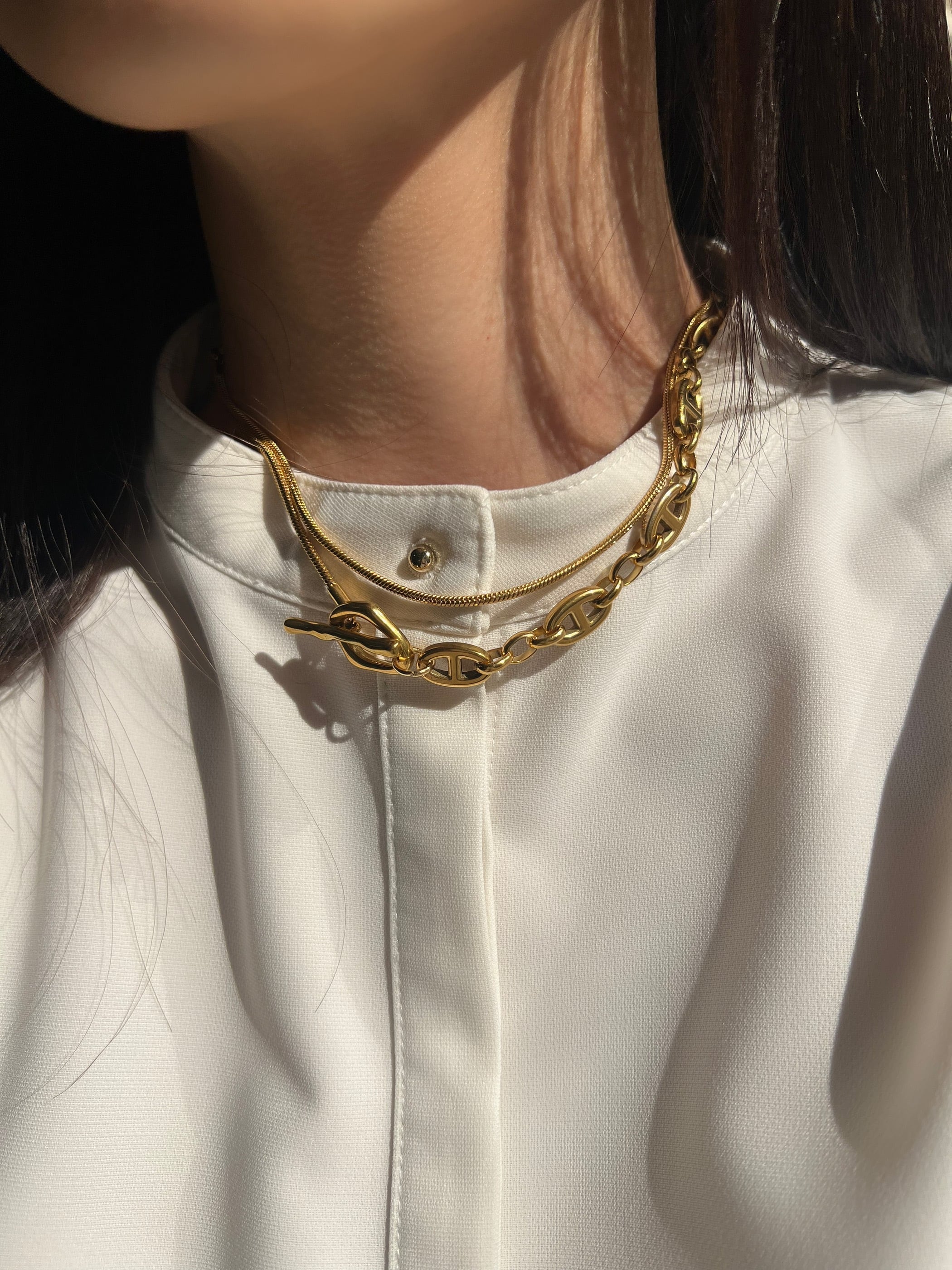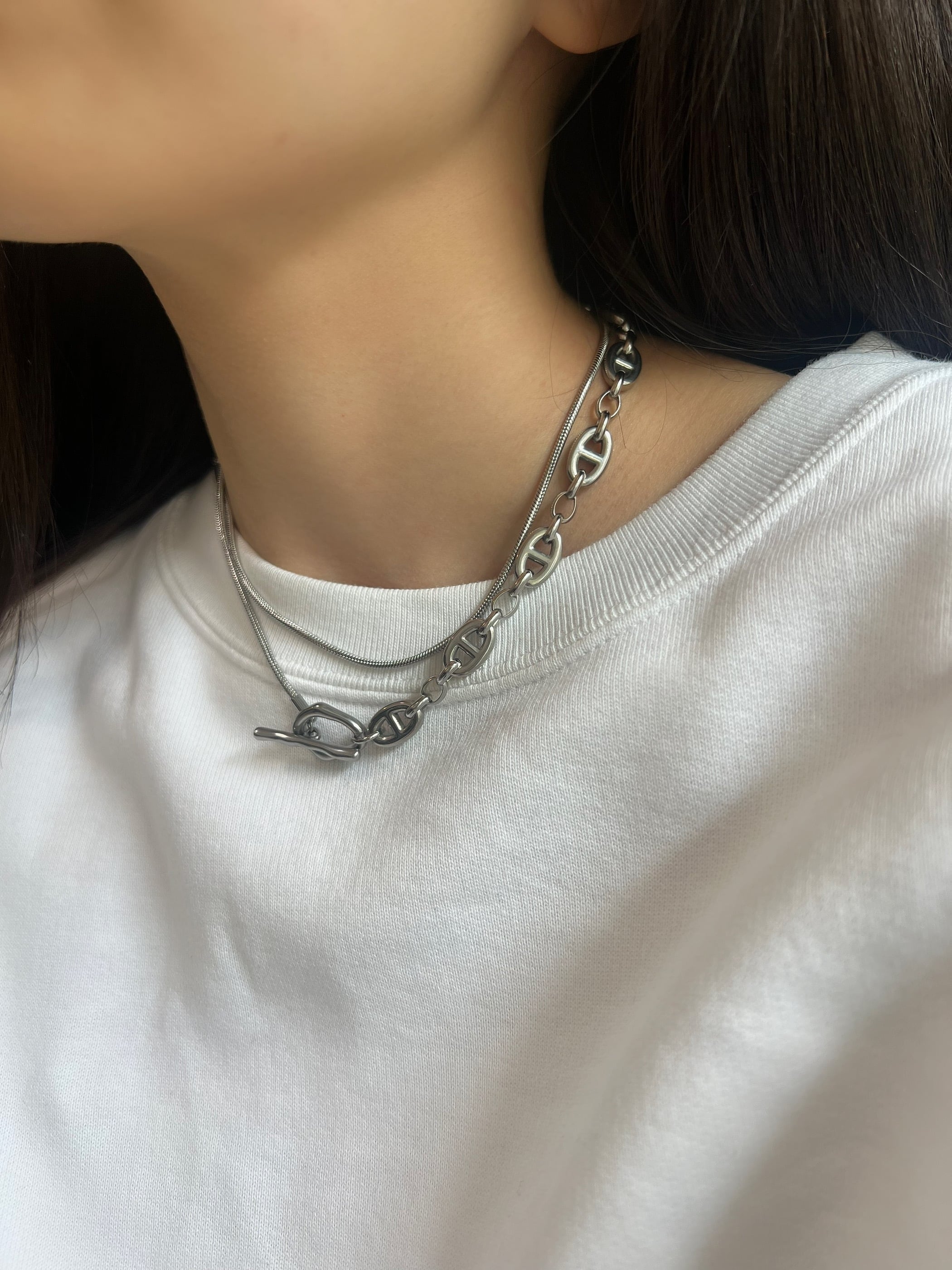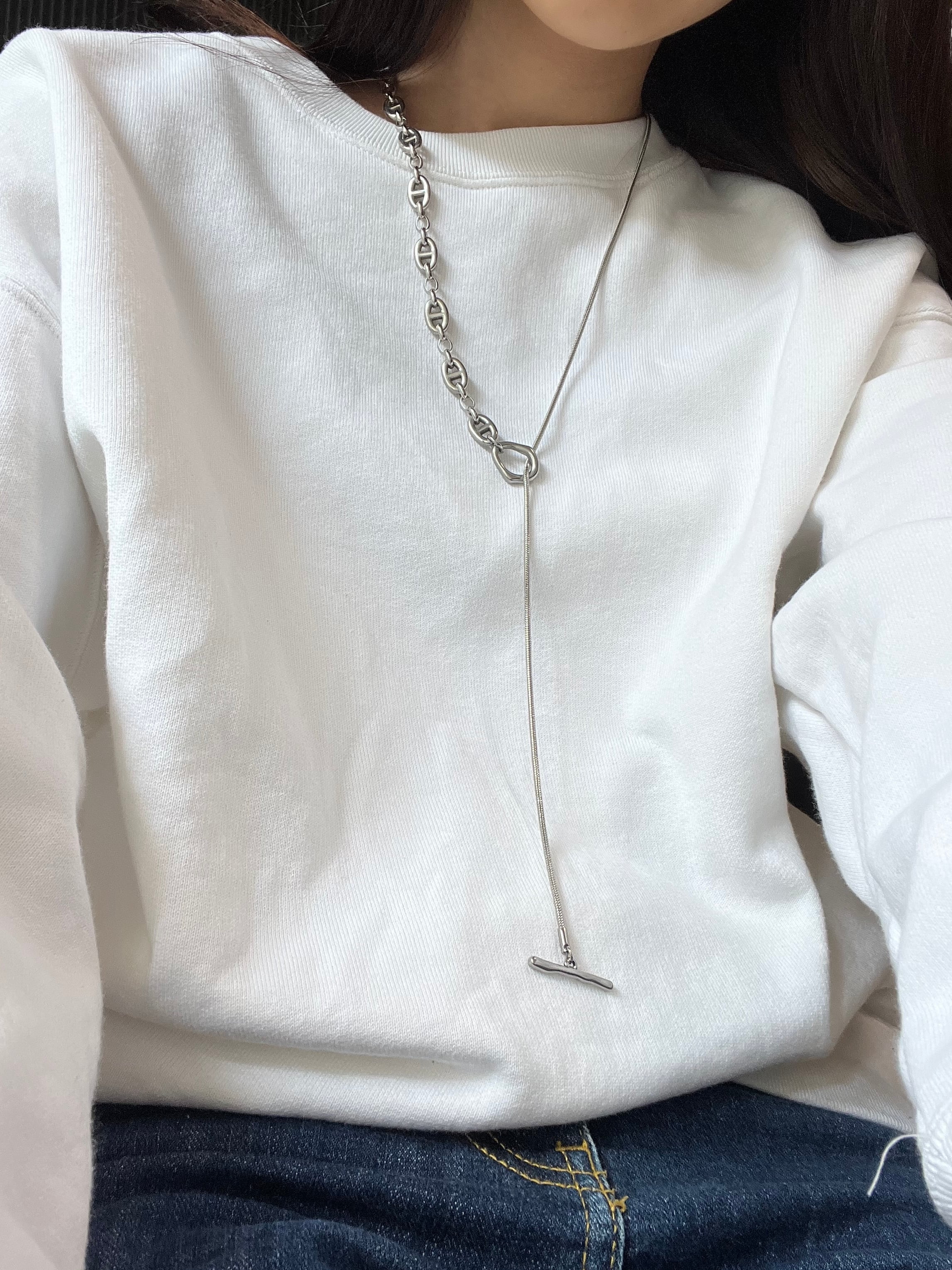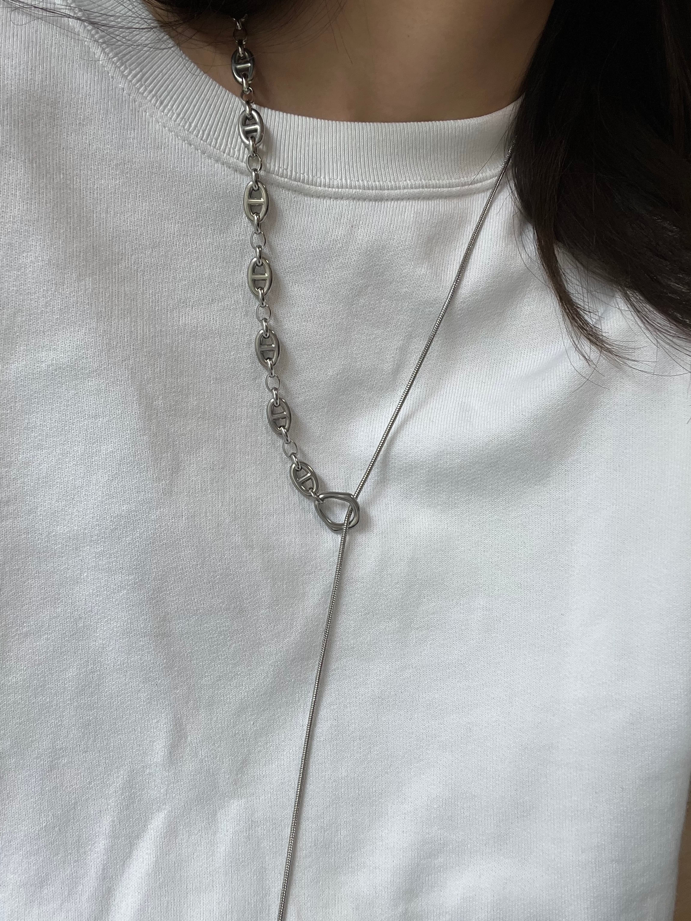 存在感のあるアンカーチェーンとシンプルなスネークチェーンの左右非対称のデザインを取り入れました。シンプルなコーディネートでもこれ一つで手抜きに見えないこなれ感のあるネックレスです。