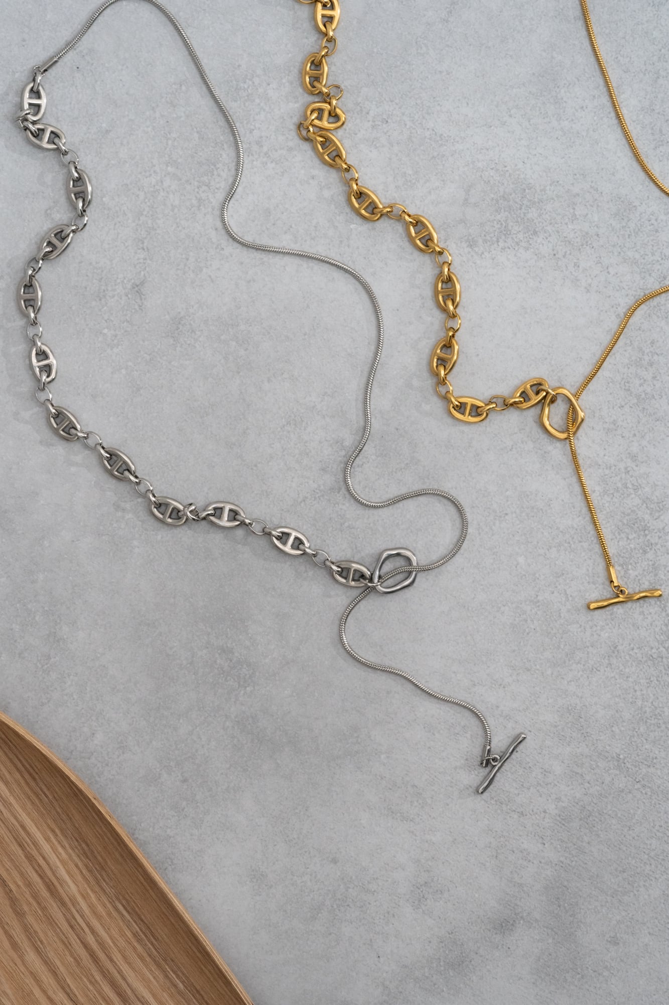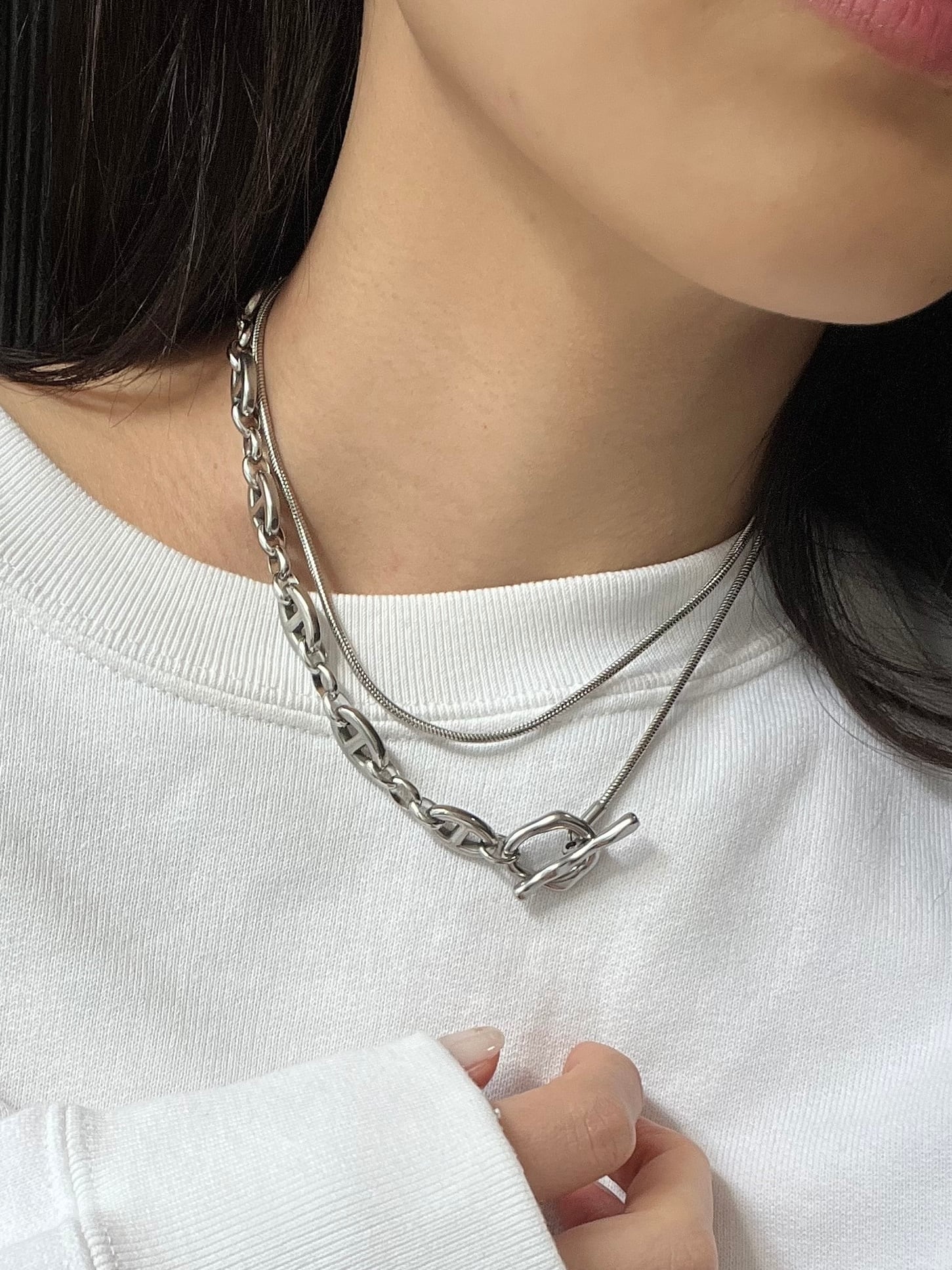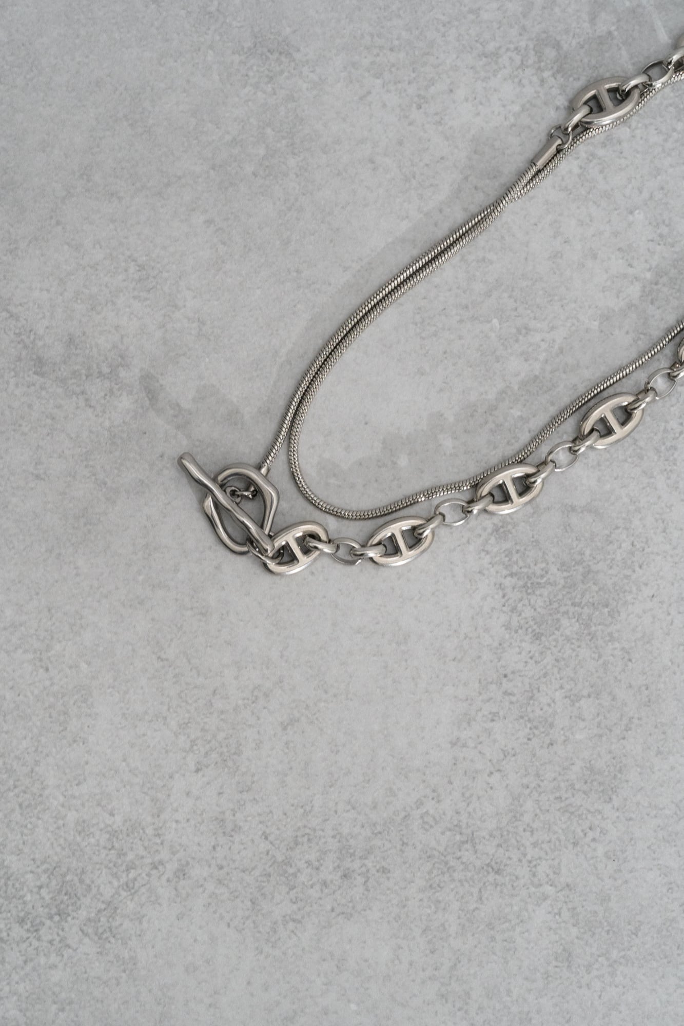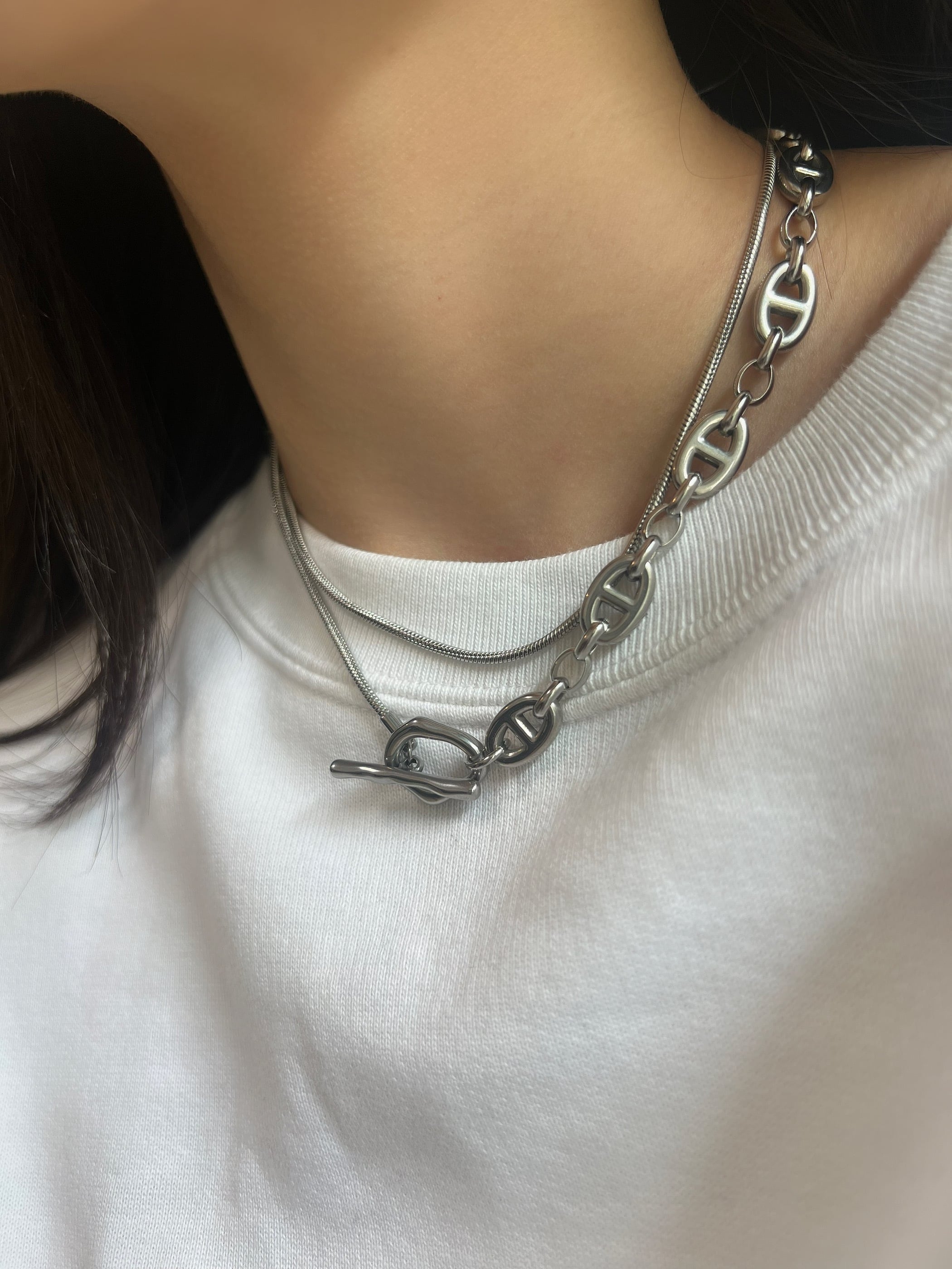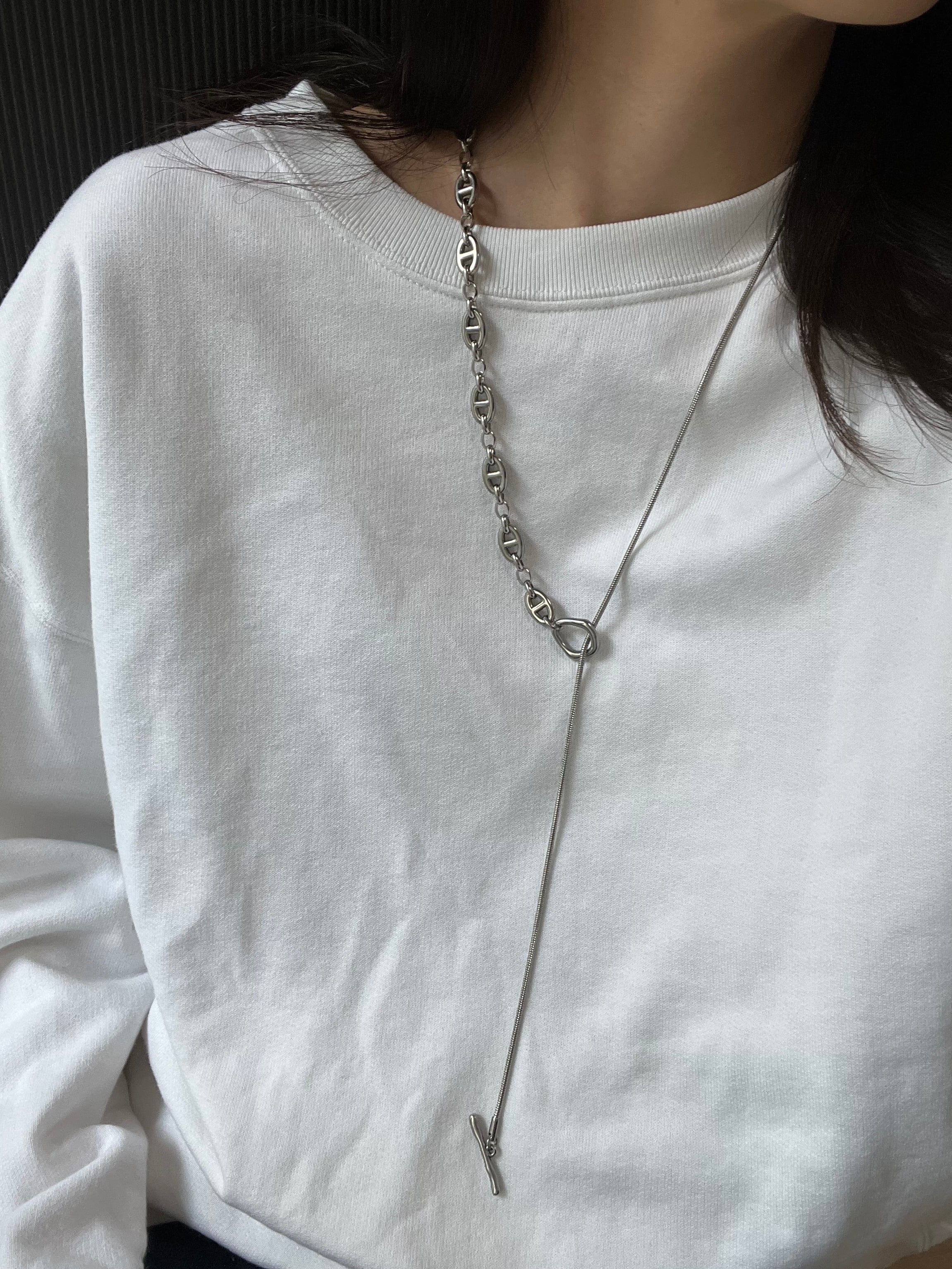存在感のあるアンカーチェーンとシンプルなスネークチェーンの左右非対称のデザインを取り入れました。シンプルなコーディネートでもこれ一つで手抜きに見えないこなれ感のあるネックレスです。