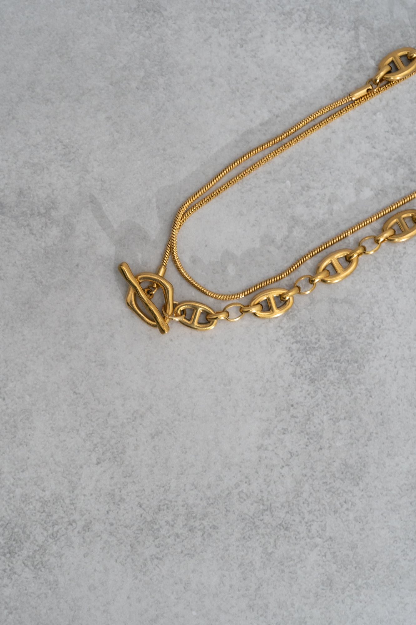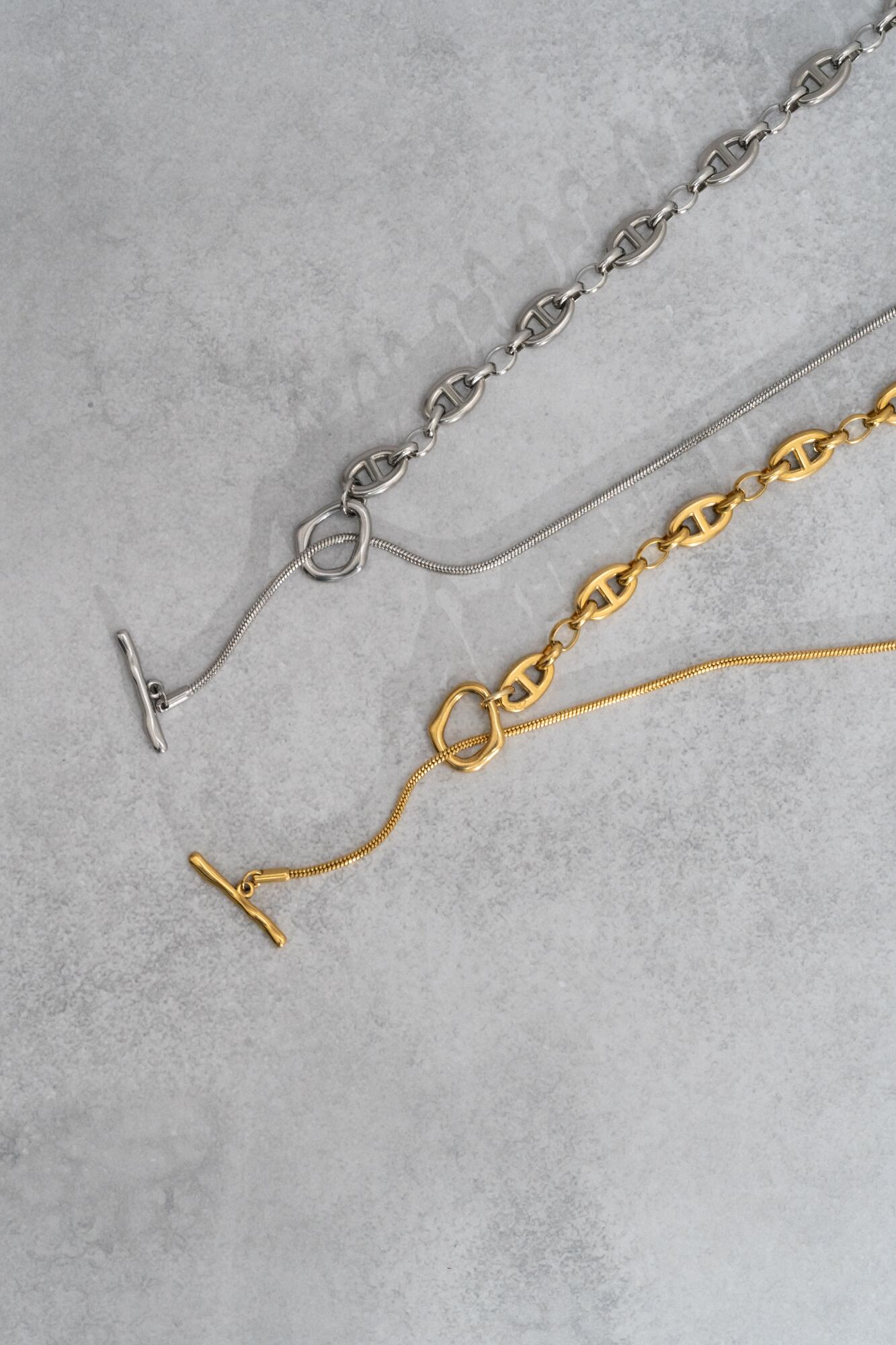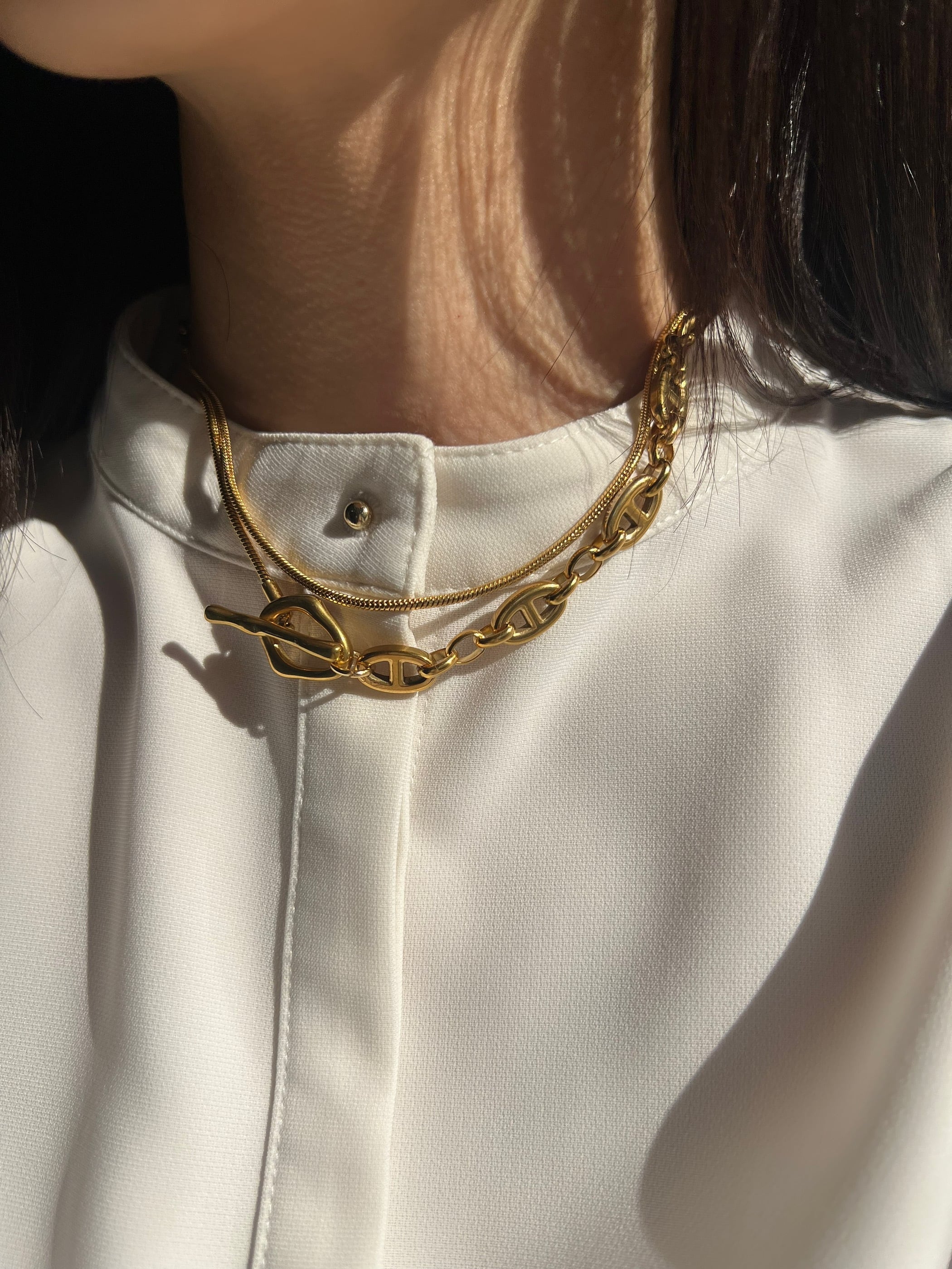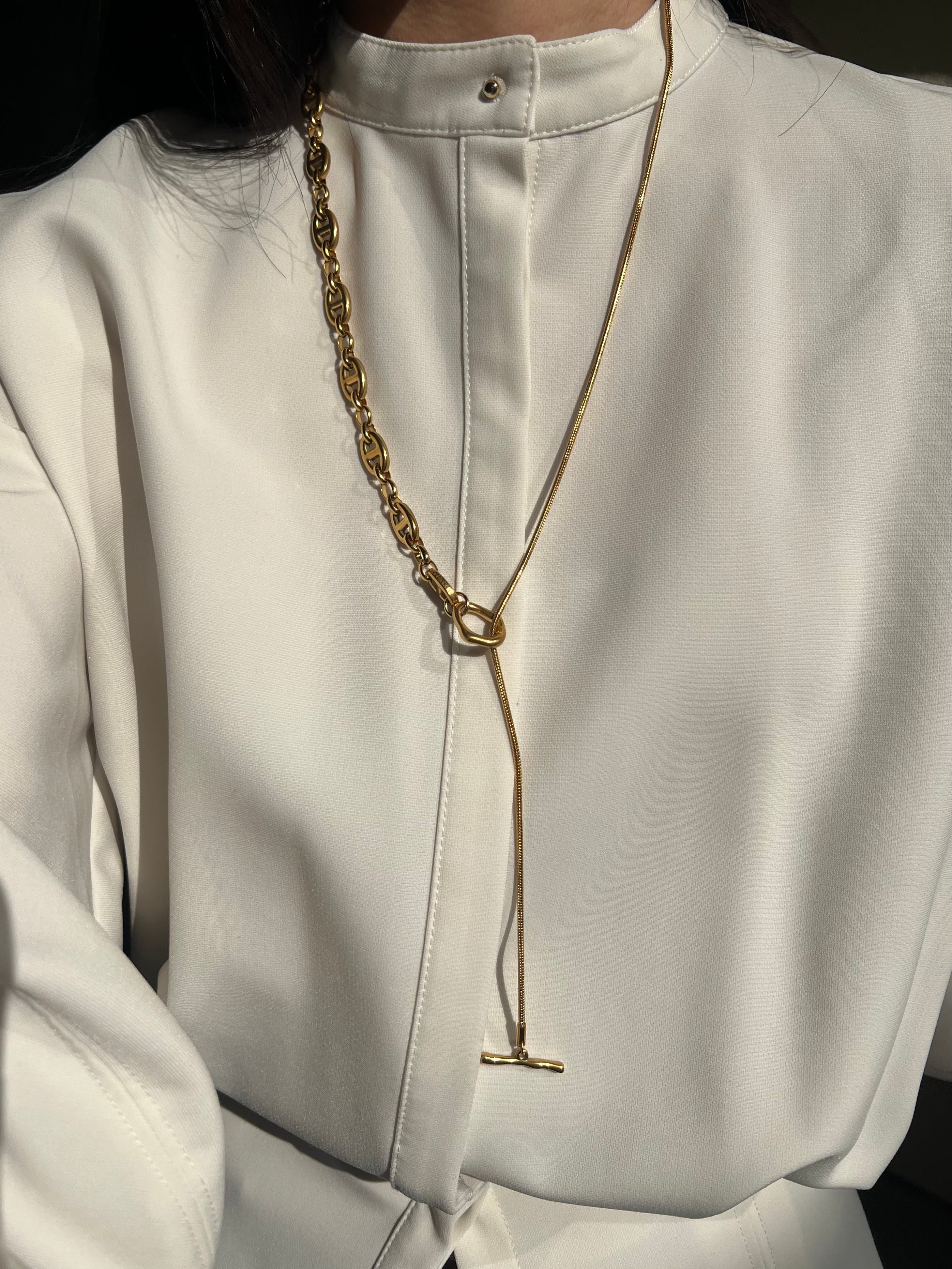 存在感のあるアンカーチェーンとシンプルなスネークチェーンの左右非対称のデザインを取り入れました。シンプルなコーディネートでもこれ一つで手抜きに見えないこなれ感のあるネックレスです。