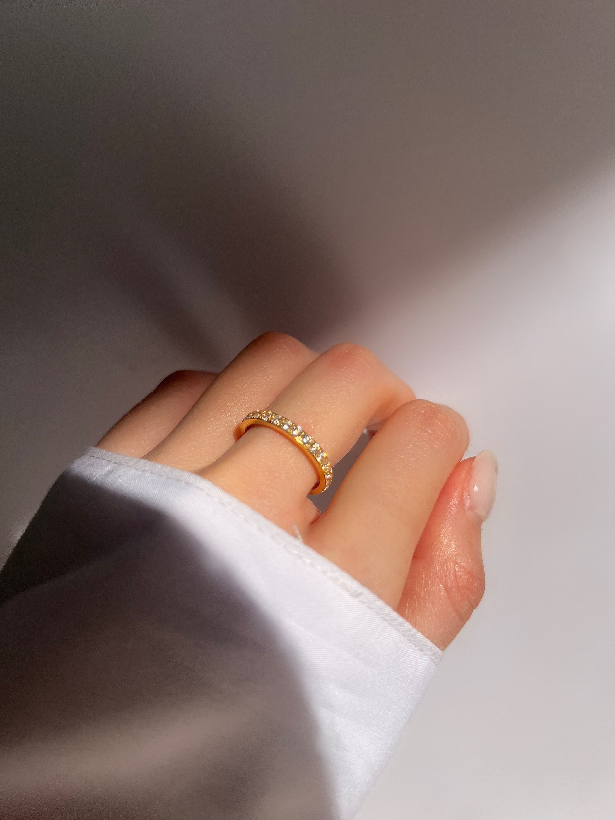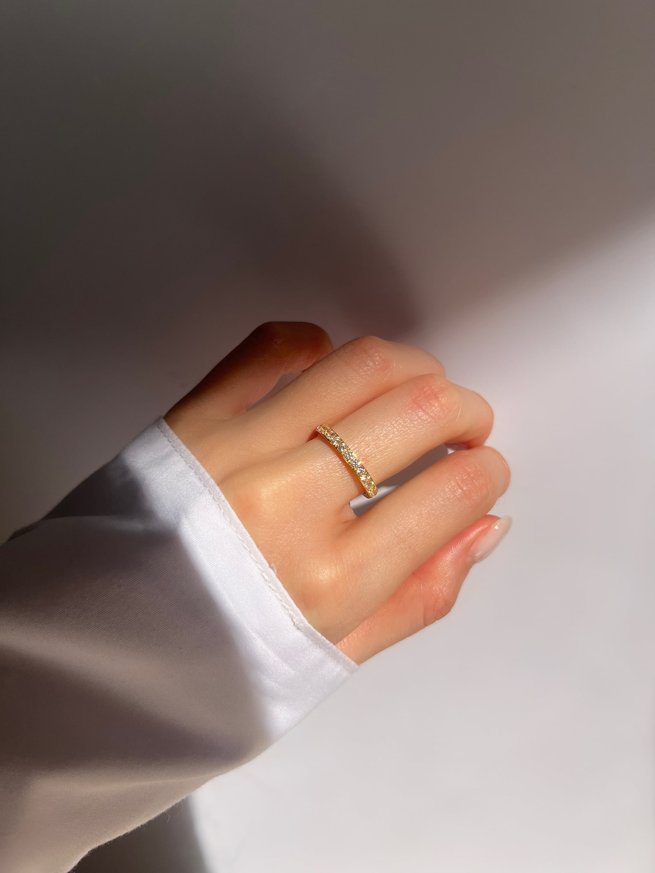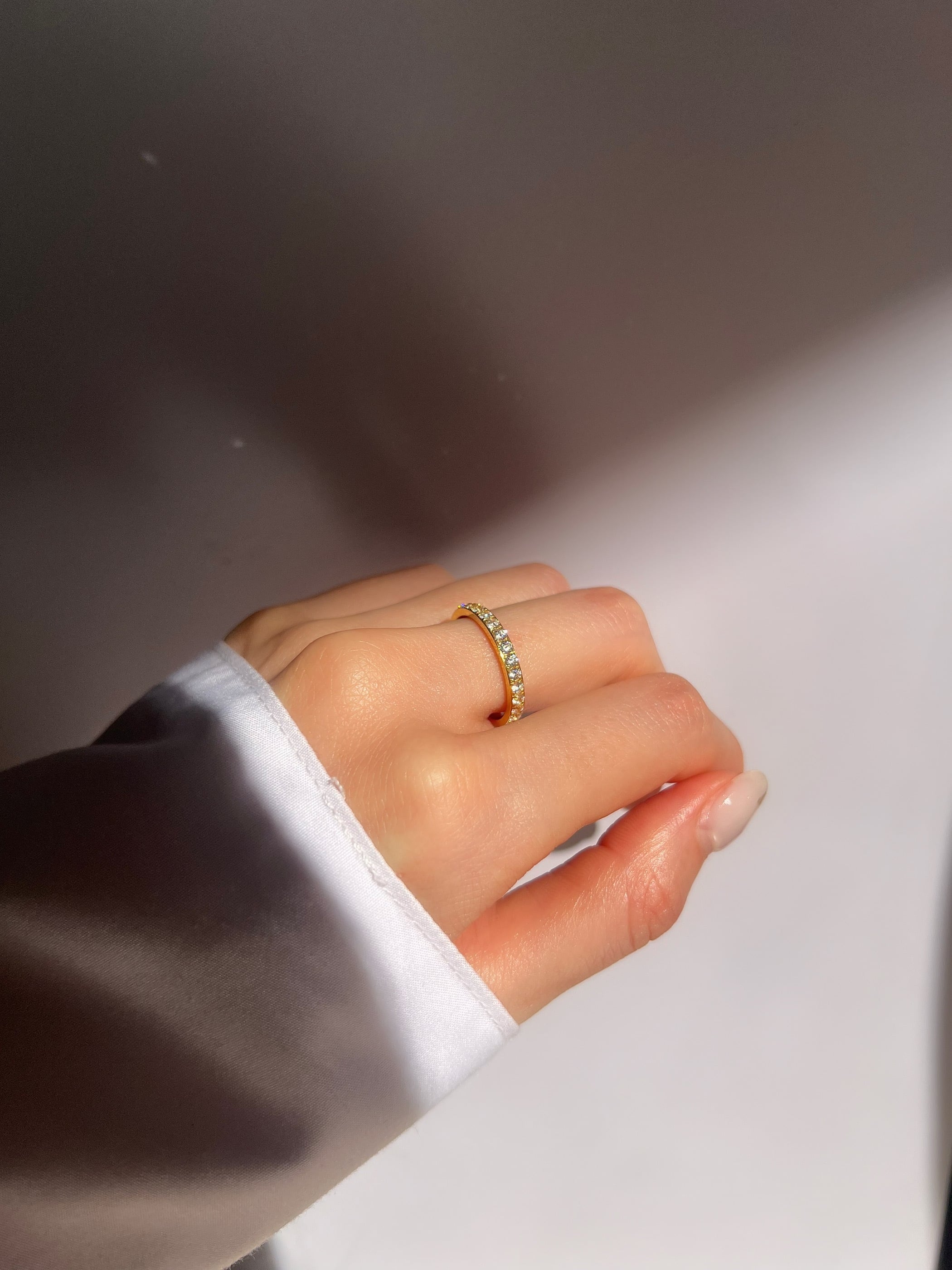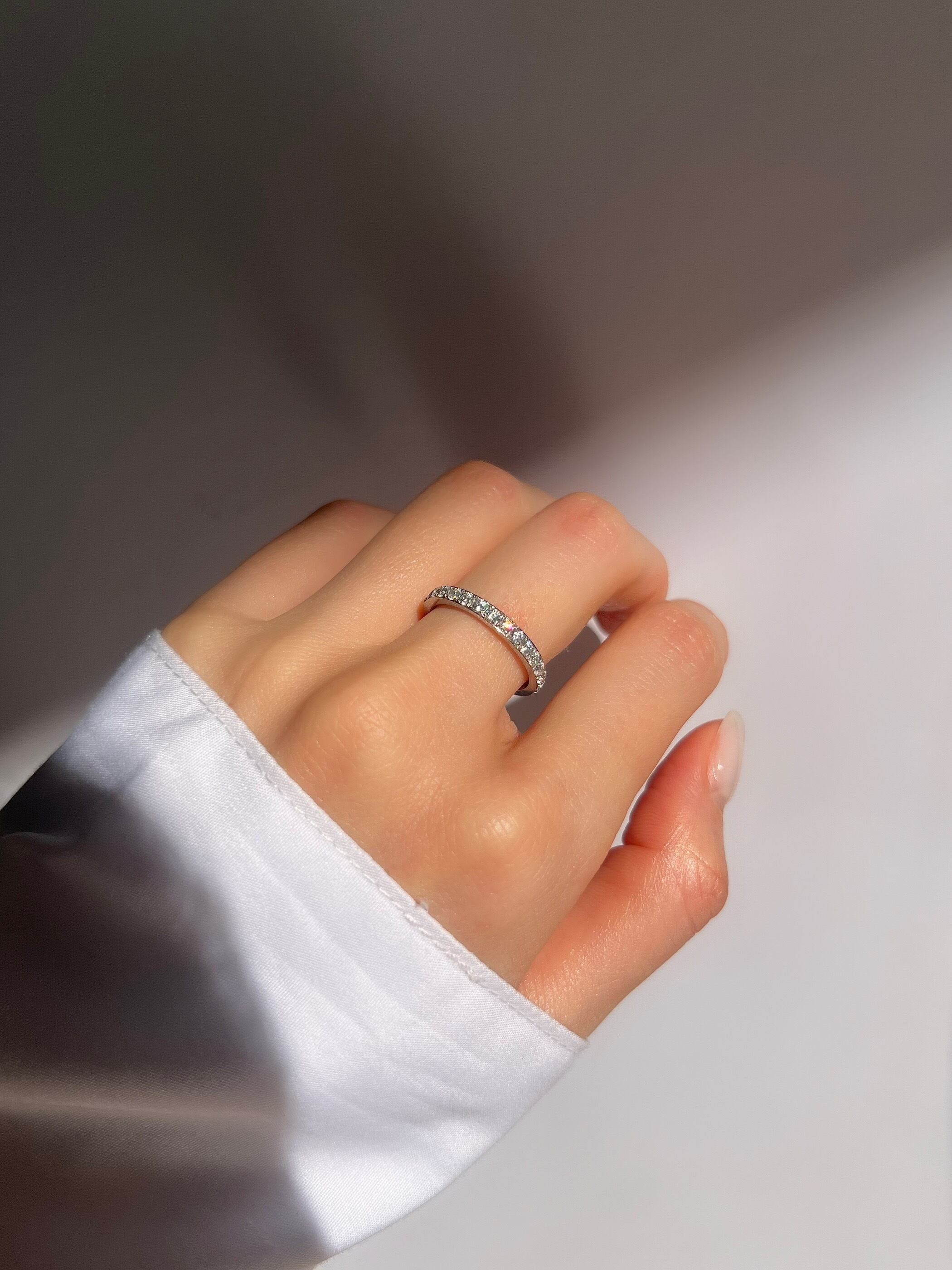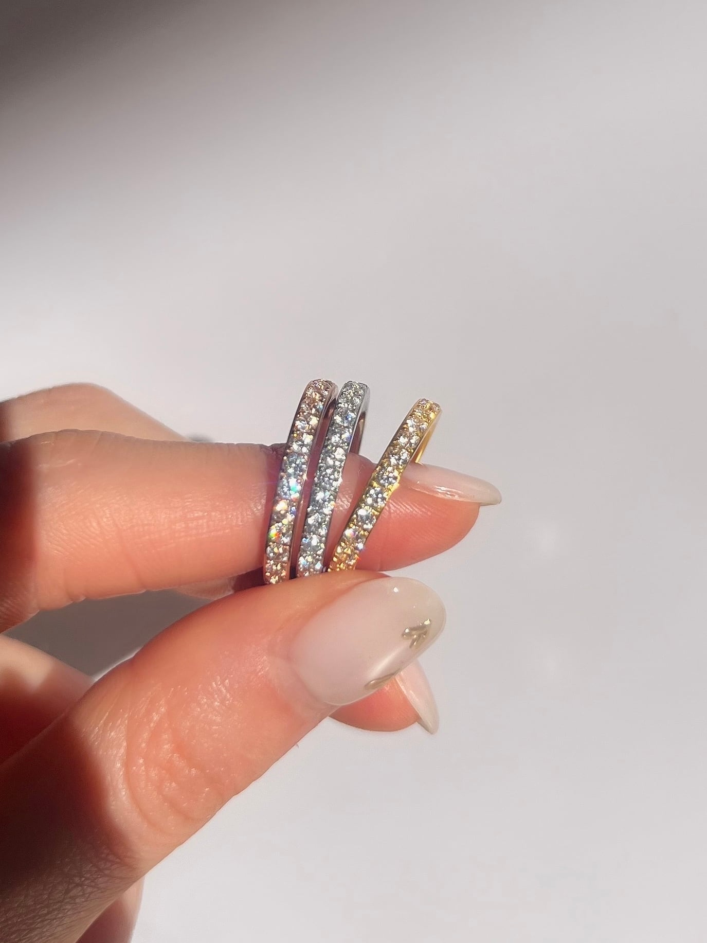 360°隙のないフルエタニティリング。光が当たることでキラキラと指先を華やかにしてくれルアイテムです。